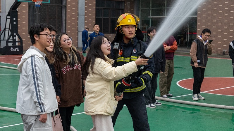 在消防训练场,同学们观看了消防员“攀绳爬楼”“水枪灭火”等精湛的技能展示,亲自上手体验了高压水枪喷射操作,真切感受到消防员在灭火救援时的艰辛。随后,同学们在消防员的指导和帮助下,登上了高达数十米的云梯车,随着工作平台缓缓升空,平日里熟悉的大学城街区呈现出全新的视角,大家在惊叹的同时,也对消防员高空救援的专业素养和超凡勇气肃然起敬。